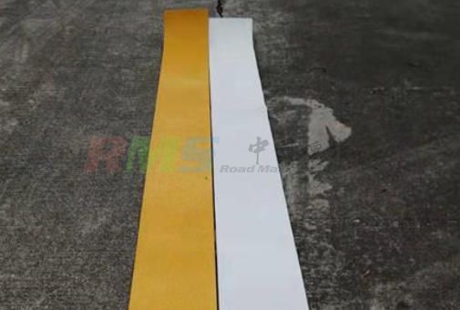 粘贴型预成型标线带(PVC材质)标线带基材内不含玻璃珠基材表面喷涂水性涂料面撒玻璃珠形成反光层粘贴面涂覆热压敏胶适用于平整光滑的路面(大空隙路面粘接强度低)